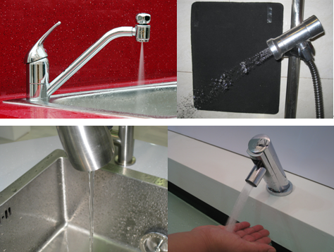 下图为由小流量约1.5L/min时出水形态逐步增大流量至9L/min时,水流都充满非连贯綫的雨粒状的汽水混合液流,大流量也不易产生水流飞濺的实用效果,使供水形态相应可视变化,做到使用户感官感觉可以清晰、鲜明直观的鉴别调控水流的形态变化。从开始用水就可以有针对性地依据不同人个性化的需求,将超出正常用水的过量无效耗水隐形水量浪费,动态掌控锁定到合理的最低限度又达到客观有效实现去污洗涤目的。做到开关(包括自动感应开关)重复开启时,可一步到位使用锁定的最佳适用水形而无需再调整,实现人性化操控的合理地高效率用水的技术进步。